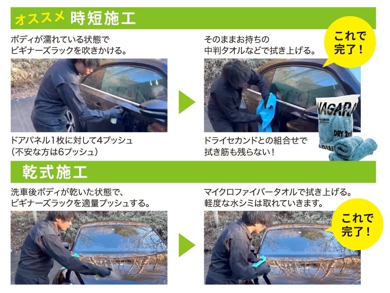 手洗い洗車等で汚れを落とす▶︎濡れたボディーに直接ビギナーズラックを吹きかける▶︎ドライセカンド等で拭き上げる